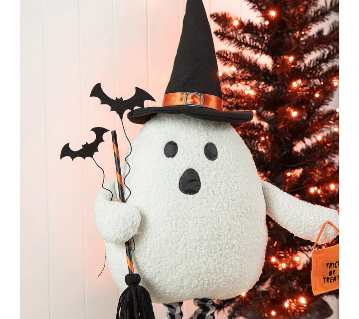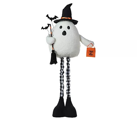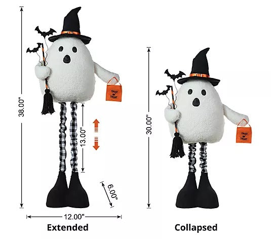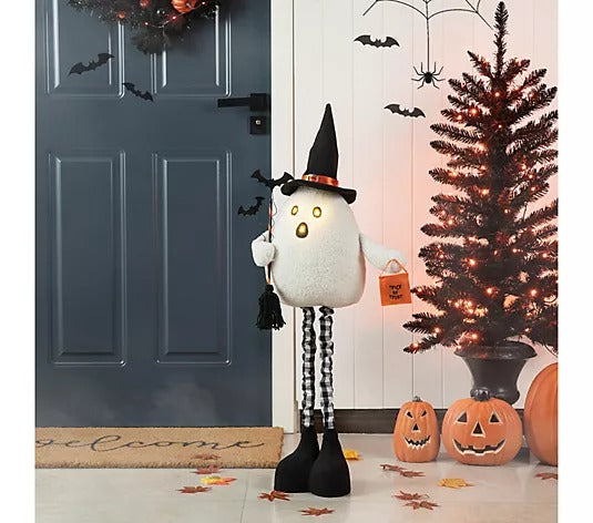Add a touch of whimsy to your Halloween decor with the lighted Halloween fabric ghost standing decor. This charming ghost features expanding legs, allowing it to stand at two different heights, and is adorned with a black broom and a "TRICK OR TREAT" pocket.